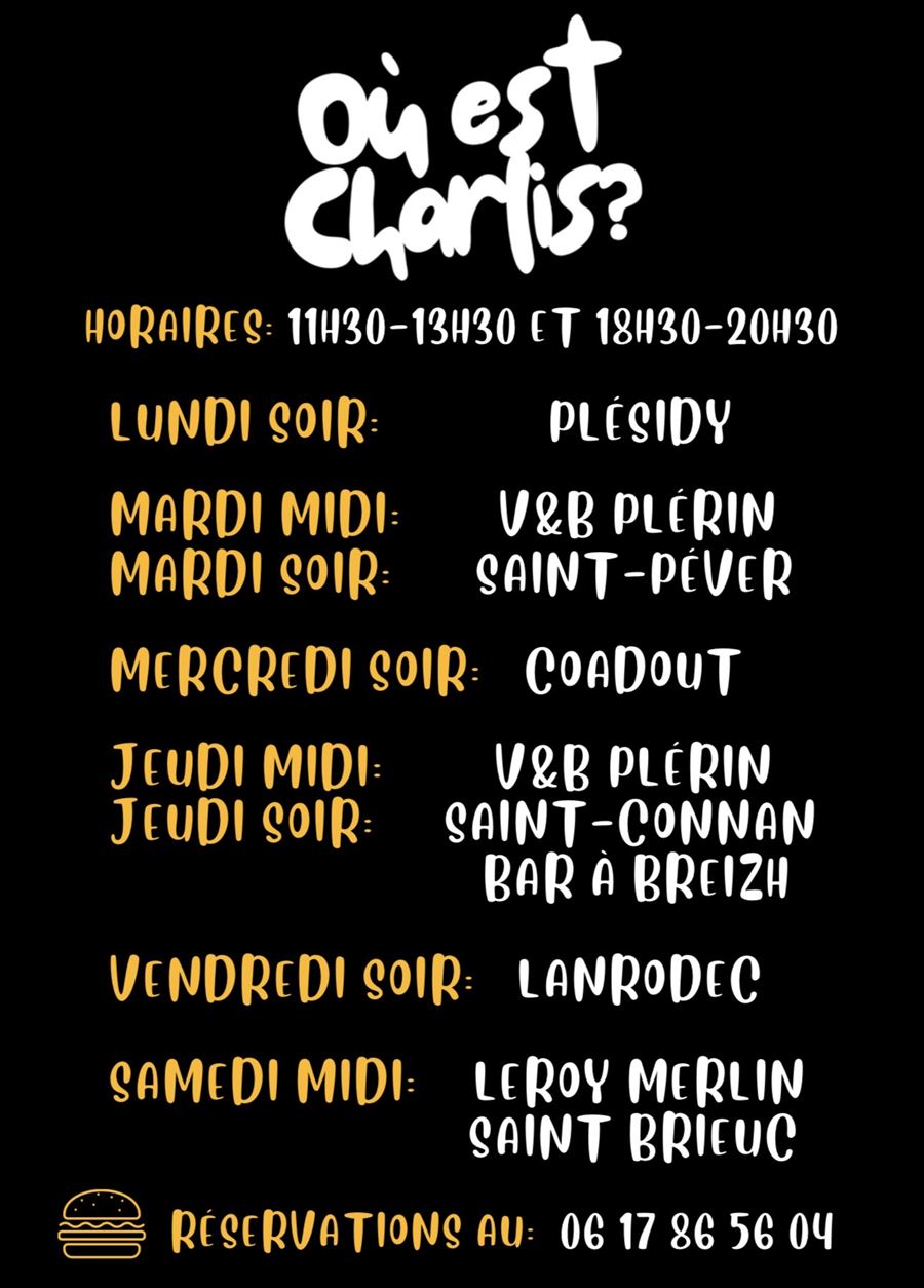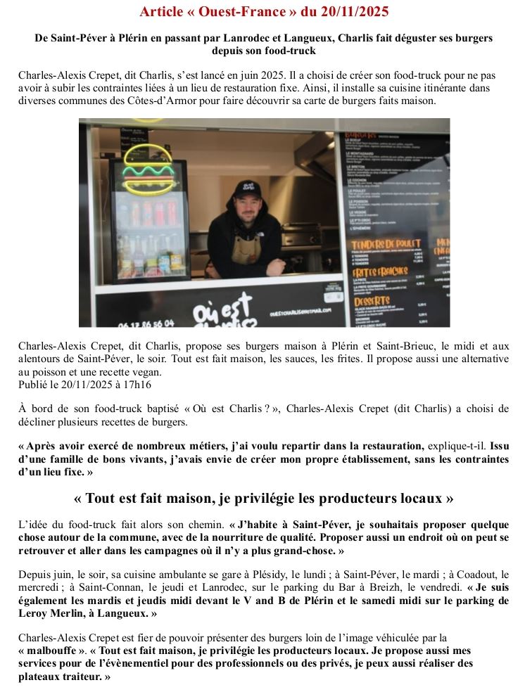 Charlys Crepet réside à Saint-Péver depuis 3 ans en face de l'école. Il sera tous les mardis soir sur la place à Saint-Péver de 18h30 à 21h30 06 17 86 56 04 charlis.crepet@hotmail.com Site internet