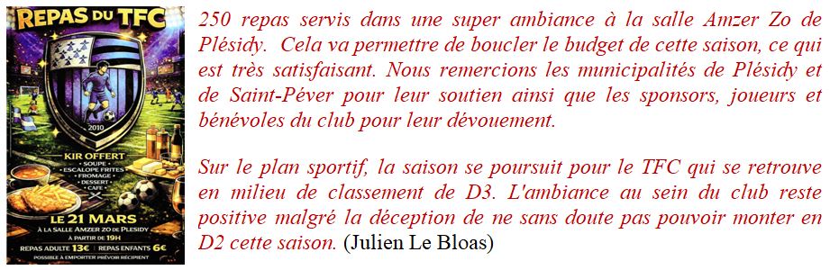 Bilan sportif : Un bilan sportif décevant mais l'équipe parvient tout de même à se maintenir en D3. Avec plus d'entrainements l'équipe aurait pu nourrir d'autres ambitions. Bilan financier : le Club reste en bonne santé financière grâce au repas du Club du mois de Février (environ 280 repas servis) et à la vente de pizzas à emporter du mois d'Octobre (environ 250 pizzas vendues). Licences : 22 licenciés la saison passée. 3 départs compensés par l'arrivé de 4 nouveaux licenciés : Rui Guimares et Cyril Le Bars (reprise) et Dorian et Yanis Serandour (Plouagat Chatelaudren). Le bureau : Le bureau ne change pas : Philippe Gautier Président, Yves Correc Trésorier, Julien Le Bloas Secrétaire. Steve Samson reste l'arbitre du Club et Jean Yves Diridollou revient en tant qu'entraineur. Remerciements : Le Club remercie les municipalités de Saint-Pever et Plésidy pour les subventions octroyées et leur soutien. |