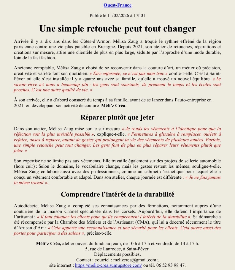 | Melisa Zaug s'installe comme couturière à Saint-Péver. Elle lance Méli'z Créa. Pévéroise depuis peu, elle a toujours aimé la couture. L'idée lui est venue de lancer sont entreprise, son mari étant souvent en déplacement. Elle s'est remise à la couture, à la période des masques. Et ça a marché, la demande est là. Elle organise même des ateliers pour apprendre la couture. « J'aime la créativité et la débrouille. J'ai vu ma mère et ma grand-mère coudre… Je possède même une machine à coudre à pédale, de 1901, que j'utilise quelquefois. » Elle crée des accessoires, des vêtements, des trousses, des sacs, fait de la personnalisation, du flocage. Elle fait aussi des réparations. « Je suis en train de refaire un siège auto. Les réparations, c'est important aujourd'hui, c'est une philosophie. » Melisa Zaug va suivre une formation bientôt à la chambre des métiers, pour apprendre à fabriquer des chapeaux. « Une couturière doit savoir tout faire », commente-t-elle. Article et photo - Sabine Le Moigne du 31 janvier 2023 |