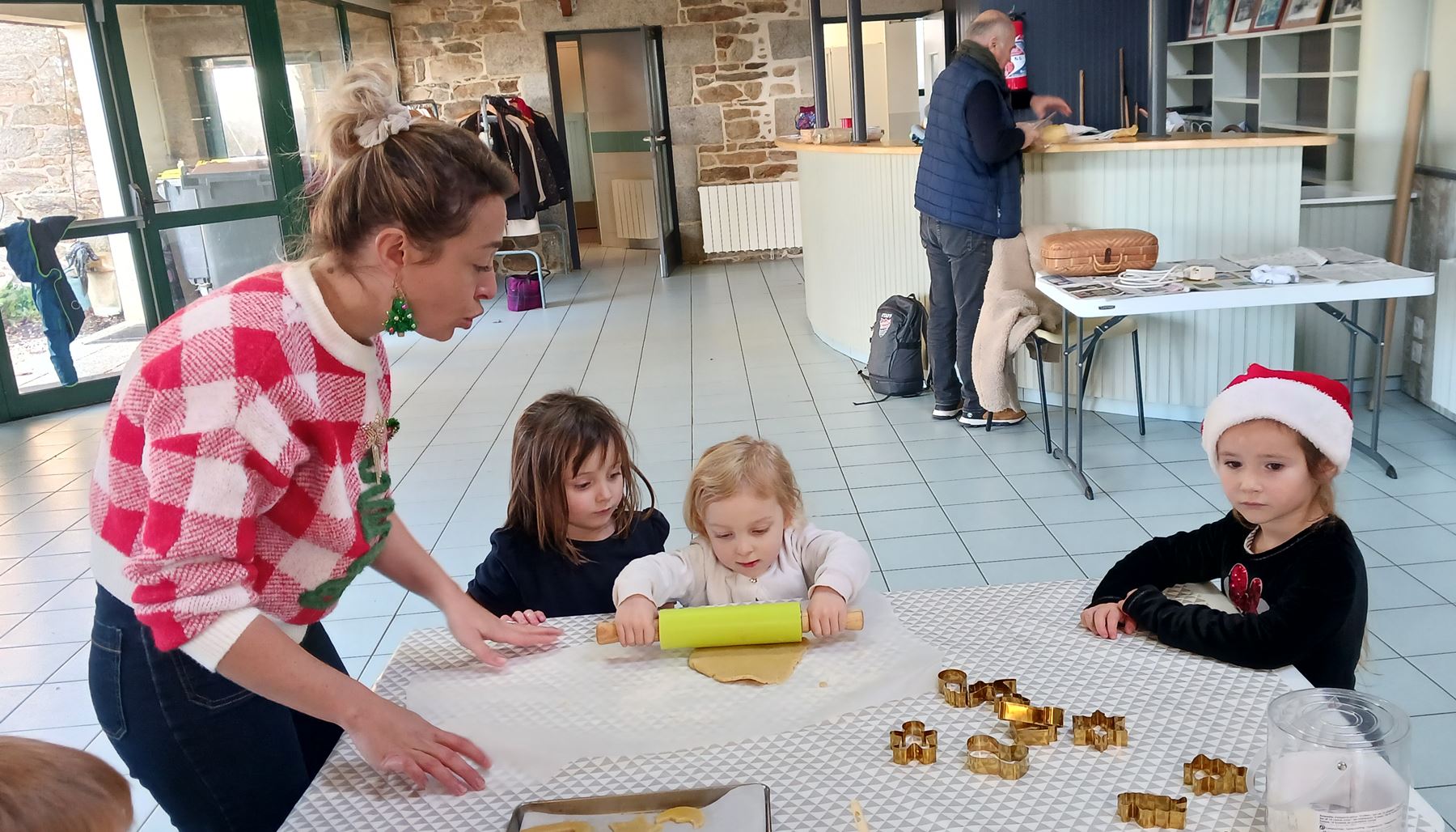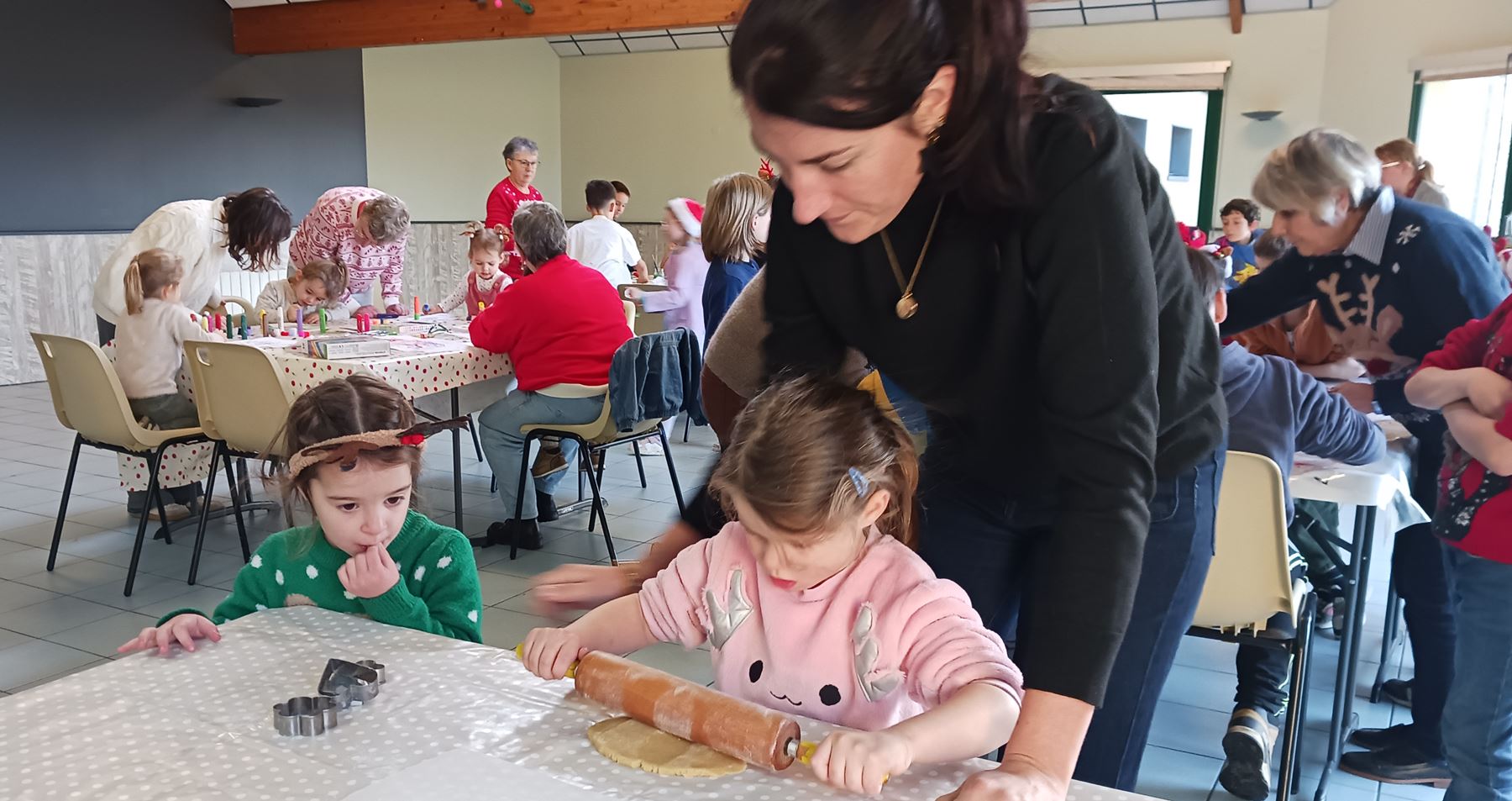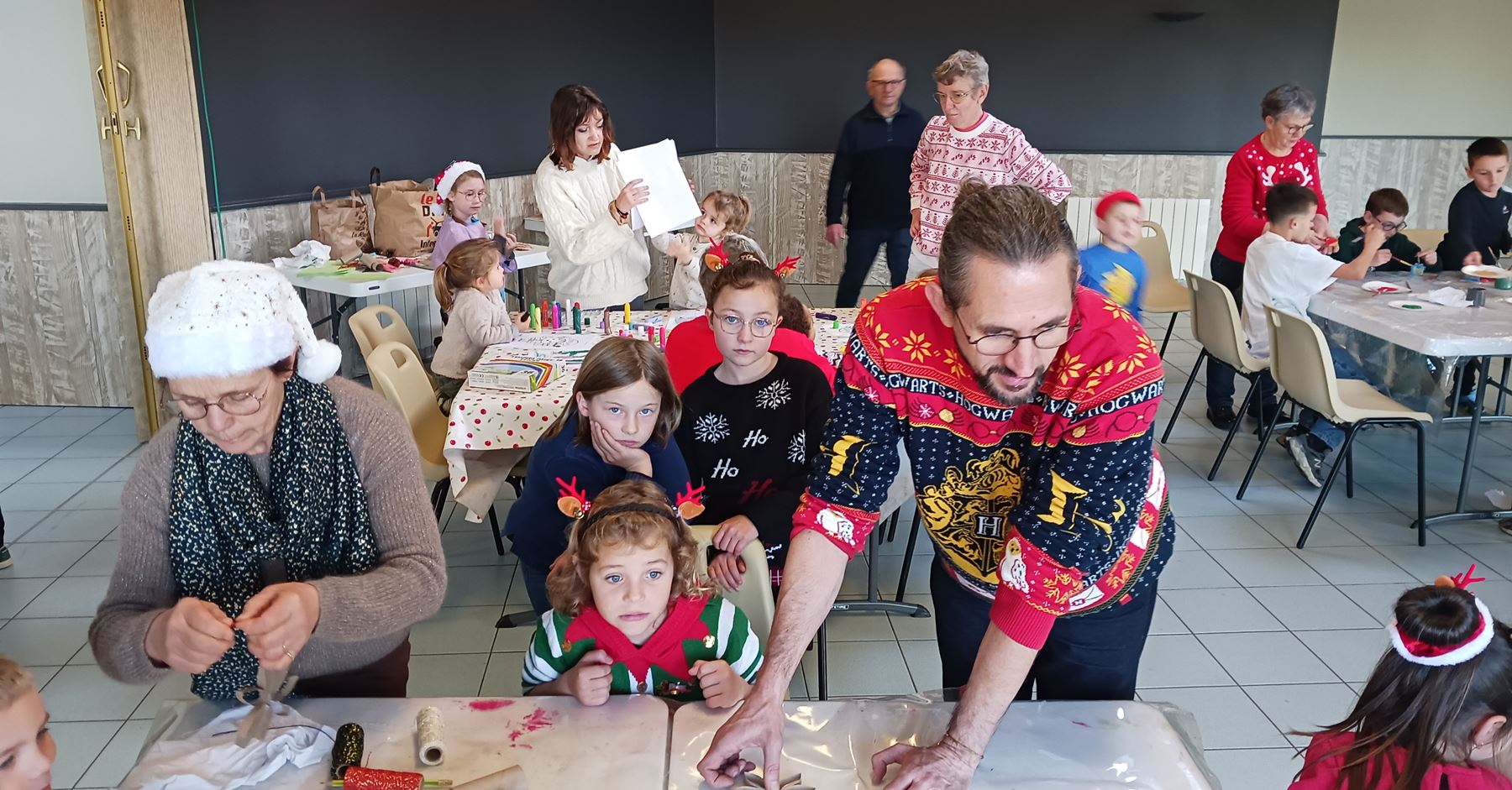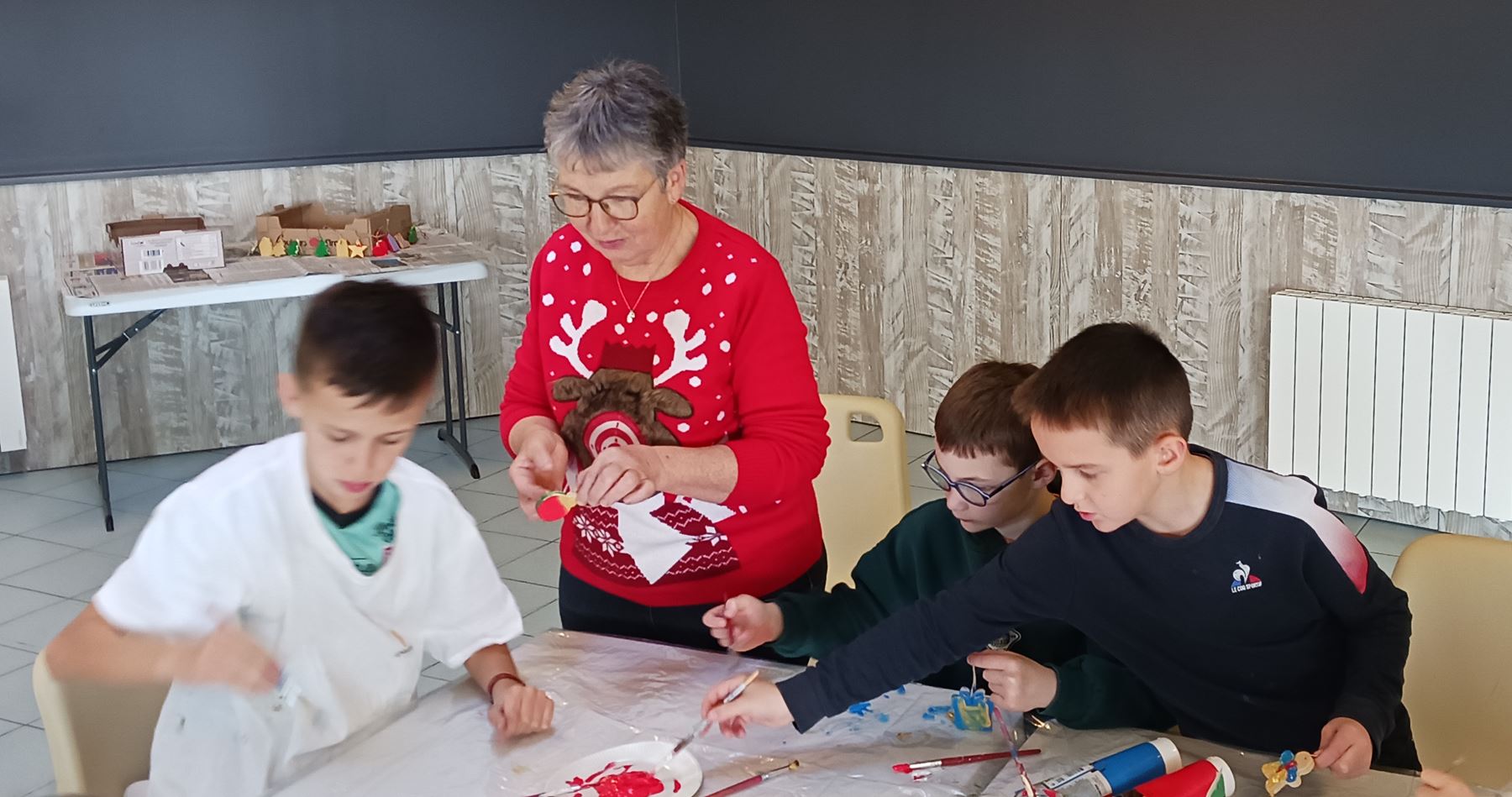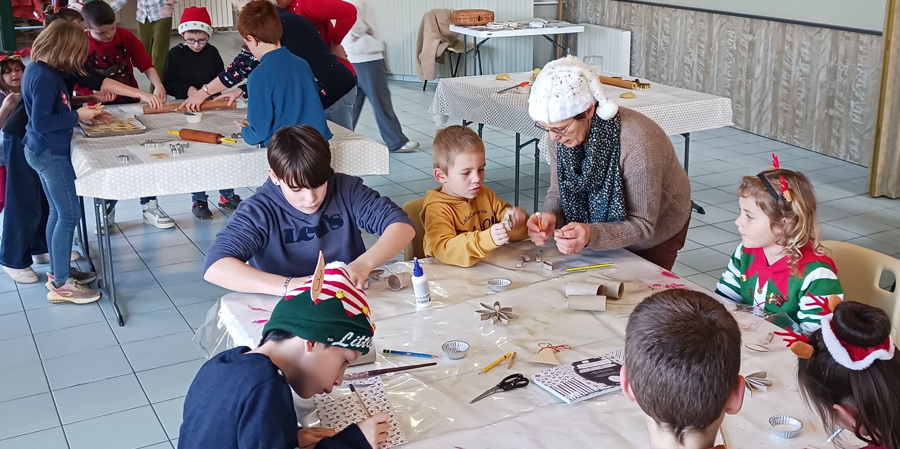Rendez-vous pour les enfants de l'école à la salle polyvalente ce matin là, à 10h30 pour des ateliers cuisine, peinture, découpage ... Mme BAHEZRE propose des ateliers gâteaux et bricolage .... Mme ZAUGG prépare des boules en tissus avec le prénom de chaque enfant brodé. Quelques adultes sont venus apporter leur soutien. |
