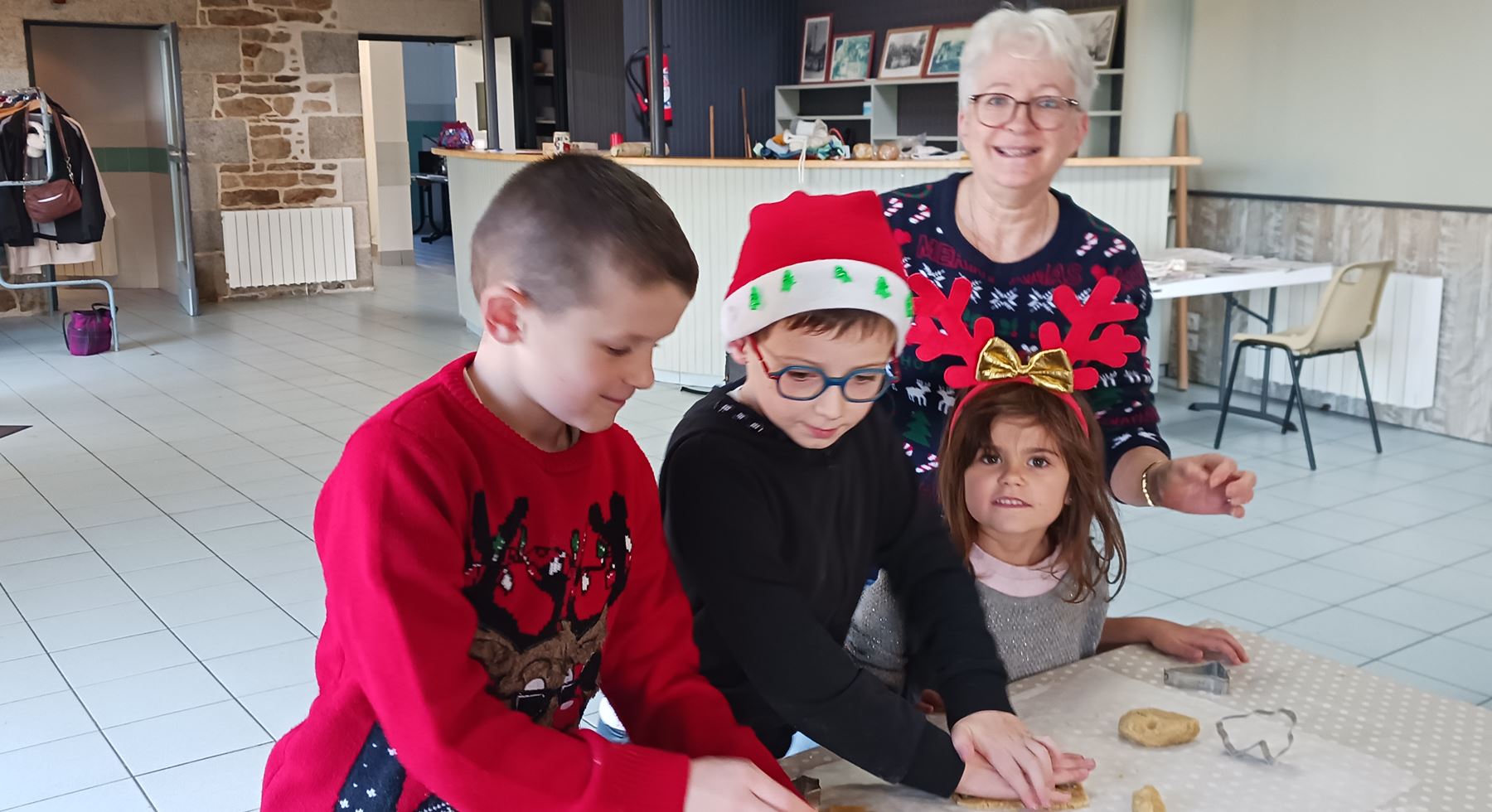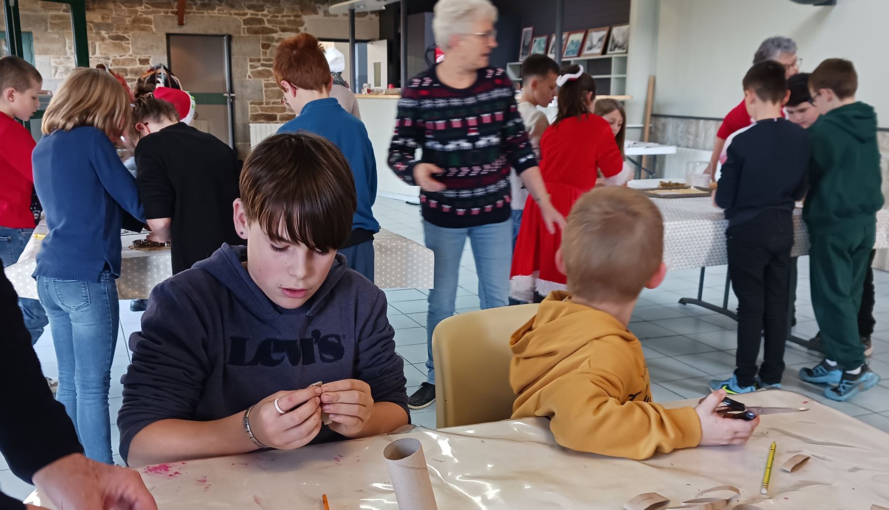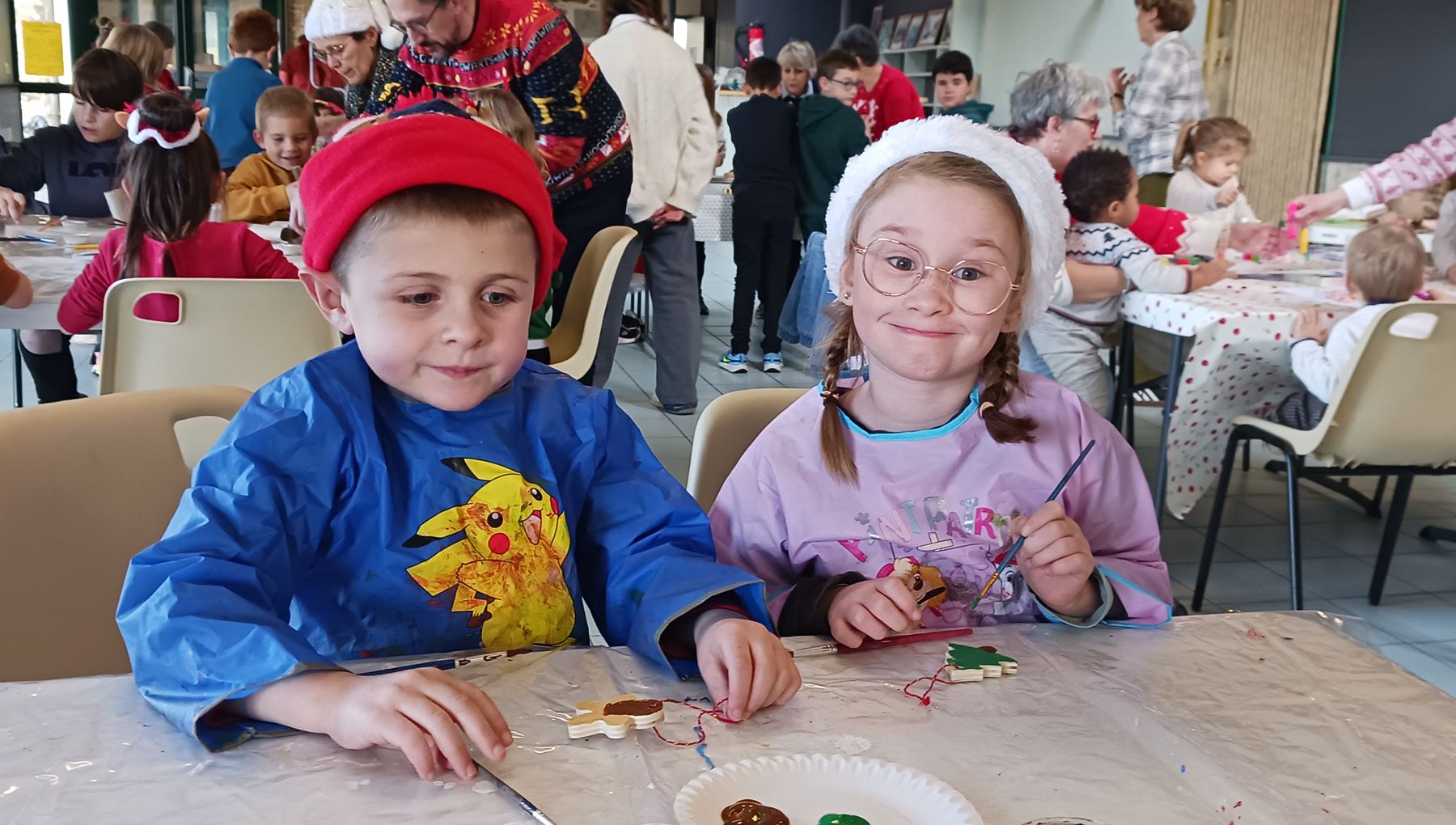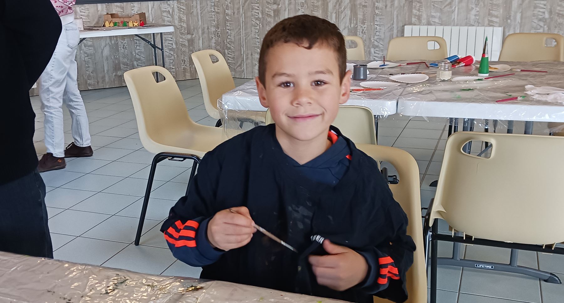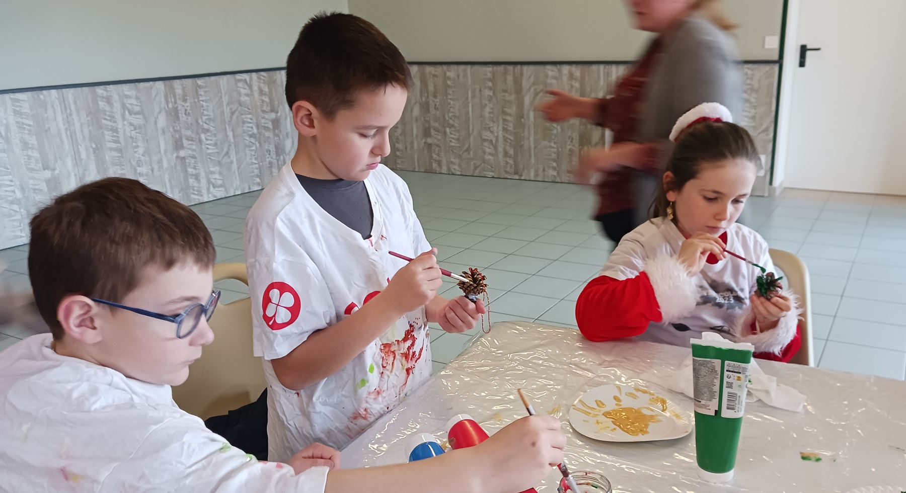 Rendez-vous pour les enfants de l'école à la salle polyvalente ce matin là, à 10h30 pour des ateliers cuisine, peinture, découpage ... Mme BAHEZRE propose des ateliers gâteaux et bricolage .... Mme ZAUGG prépare des boules en tissus avec le prénom de chaque enfant brodé. Quelques adultes sont venus apporter leur soutien. |